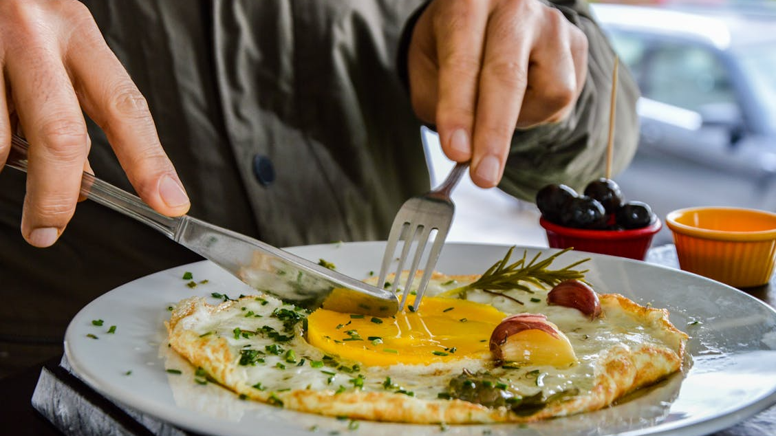 One crack splits the shell open, then a fork whirls through till liquid gold forms. Into hot metal they pour, hissing low at first. A fold begins – edge drawn inward – while pale shreds rain down from above; warmth coaxes their melt. Only a pinch of salt passes over, barely seen.