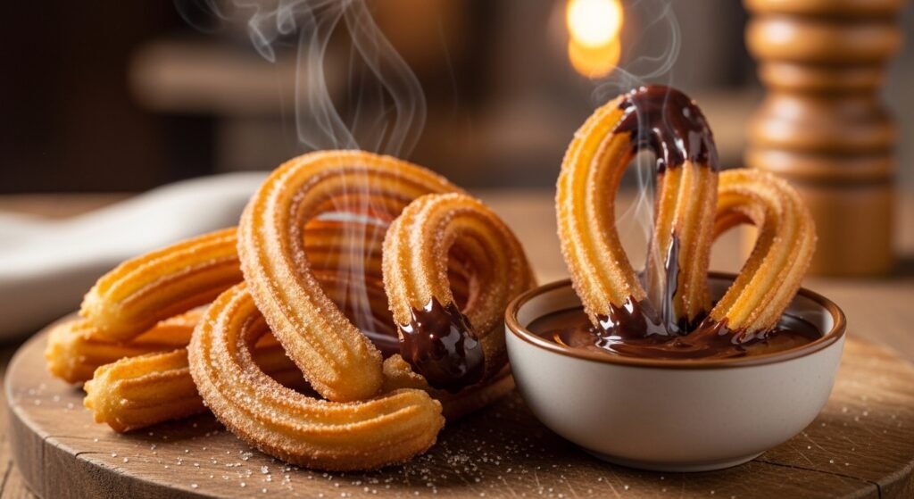 The dough is piped into a hot oil and fried until golden and crisp. Once cooked, the churros are carpeted in sugar and occasionally cinnamon. They are frequently served with thick hot chocolate for dipping. The combination of brickle surface and soft innards makes them infectious.