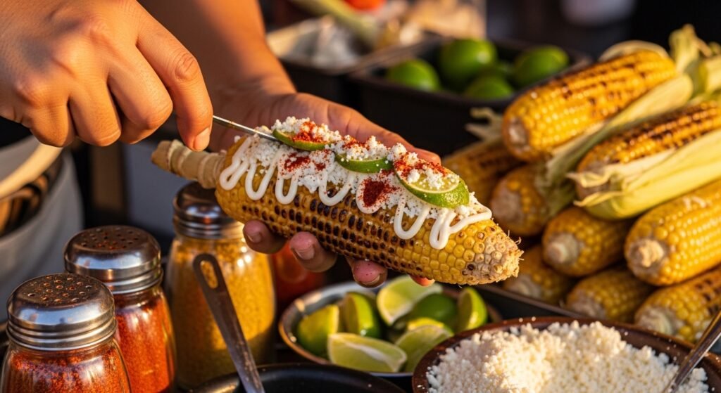 Merchandisers cover roasted elote on the cob with mayonnaise, lime juice, chili greasepaint, and atrophied cheese. The combination creates a rich, and slightly racy flavor that has come worldwide. The hoarse grilled taste adds another subcaste of depth that makes this road snack indelible.