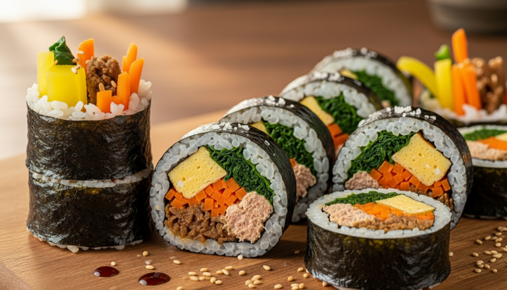 Pickled radish, egg, carrots, spinach, and seasoned meat or tuna are typical  constituents. The rolls are cut into movable, suck- sized pieces. Although it looks like sushi, the flavours and  constituents are very Korean.