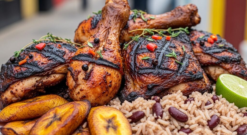 The chicken is marinated in an admixture of Scotch bonnet peppers, allspice, thyme, garlic, and other spices before being grilled sluggishly over pimento wood. The result is deeply  scrumptious meat with a charred surface and juicy innards. Street merchandisers frequently serve it with rice and peas or fried plantains.