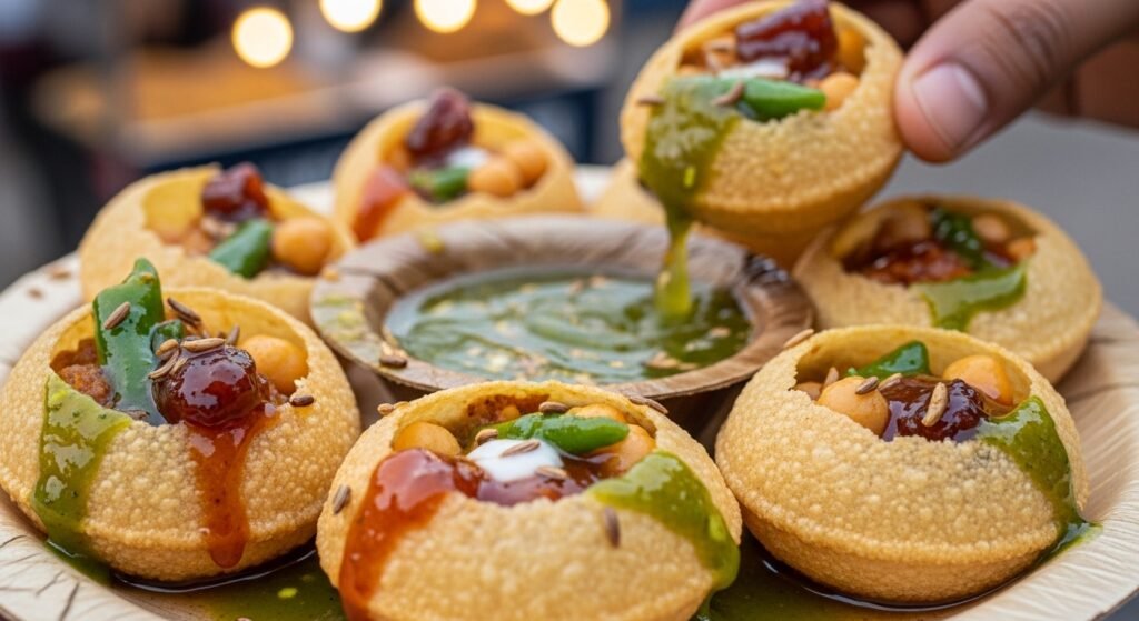 Pani puri is one of India’s most instigative and interactive road foods. A mix of spiced mashed potatoes, chickpeas, and sweet-sour chutneys fills bitsy, hollow fried puris. The end product is a single nibble that’s both stimulating and bursting with flavours and textures.