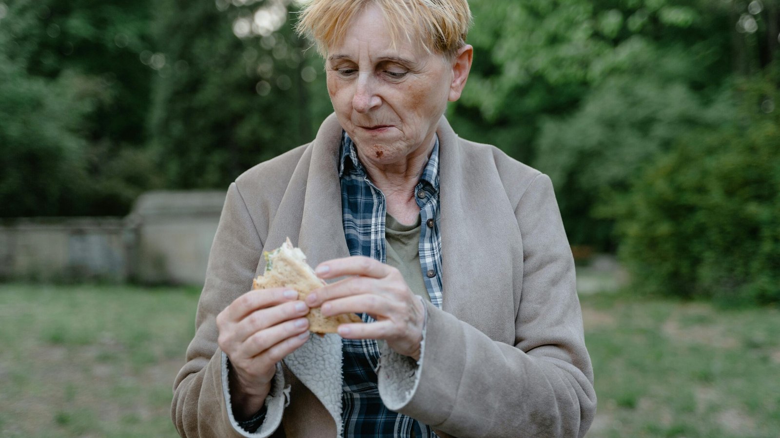 Photo by MART PRODUCTION: https://www.pexels.com/photo/adult-woman-in-brown-coat-holding-a-sandwich-8078575/